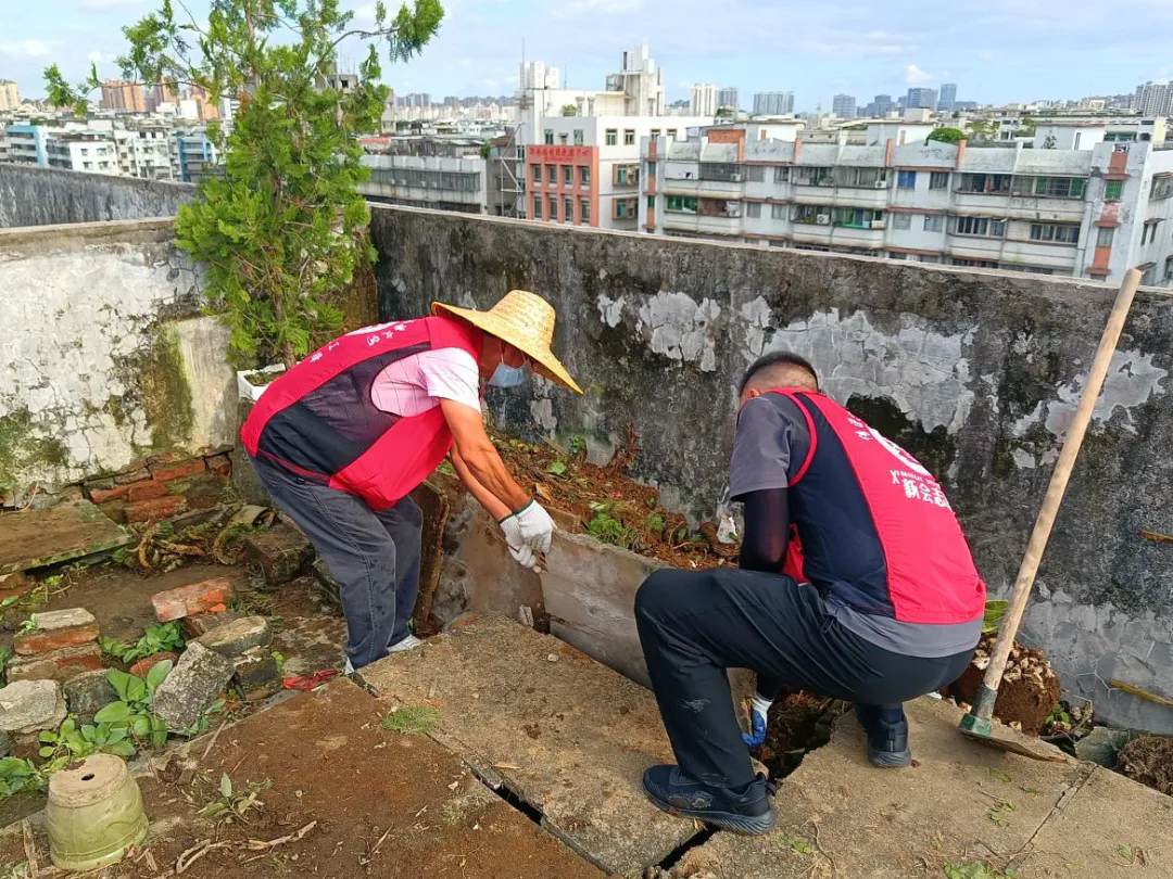 图为区纪委监委党员义工到社区参与防蚊灭蚊工作,清理楼顶天台杂草杂物。